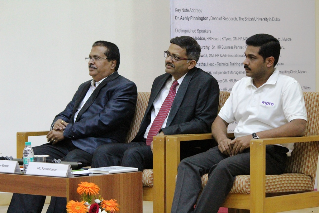 Mr. Vikram Hebbar, General Manager (HR&IR) at JK Tyre & Industries Ltd., Mysuru; Mr. Sandesh Murchy, Sr. HR Business Partner at Oracle India Pvt. Ltd, Bengaluru; Mr. Ananta Gouda, General Manager – HR & Administration at Jubilant Generics Limited, Mysore; & Cmdr. Manjunatha, Head – Technical Training at Larsen & Toubro Limited, Mysuru |